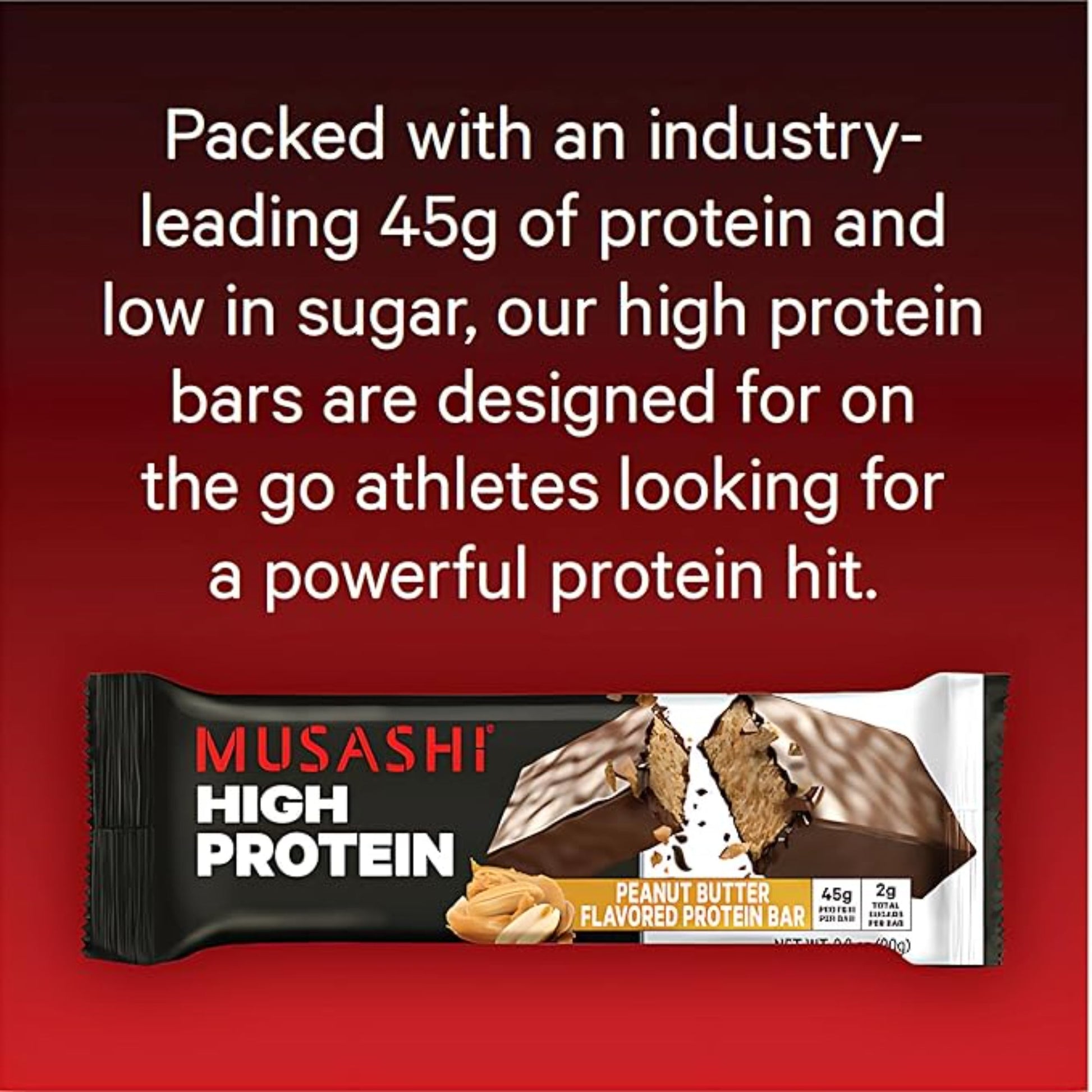 MUSASHI High Protein Bar, 45g Protein, 2g Total Sugars, Peanut Butter & Milk Chocolate Coated, Post Workout and Protein Snack On The Go, 12 Pack of 3.2oz (90g) Bars
