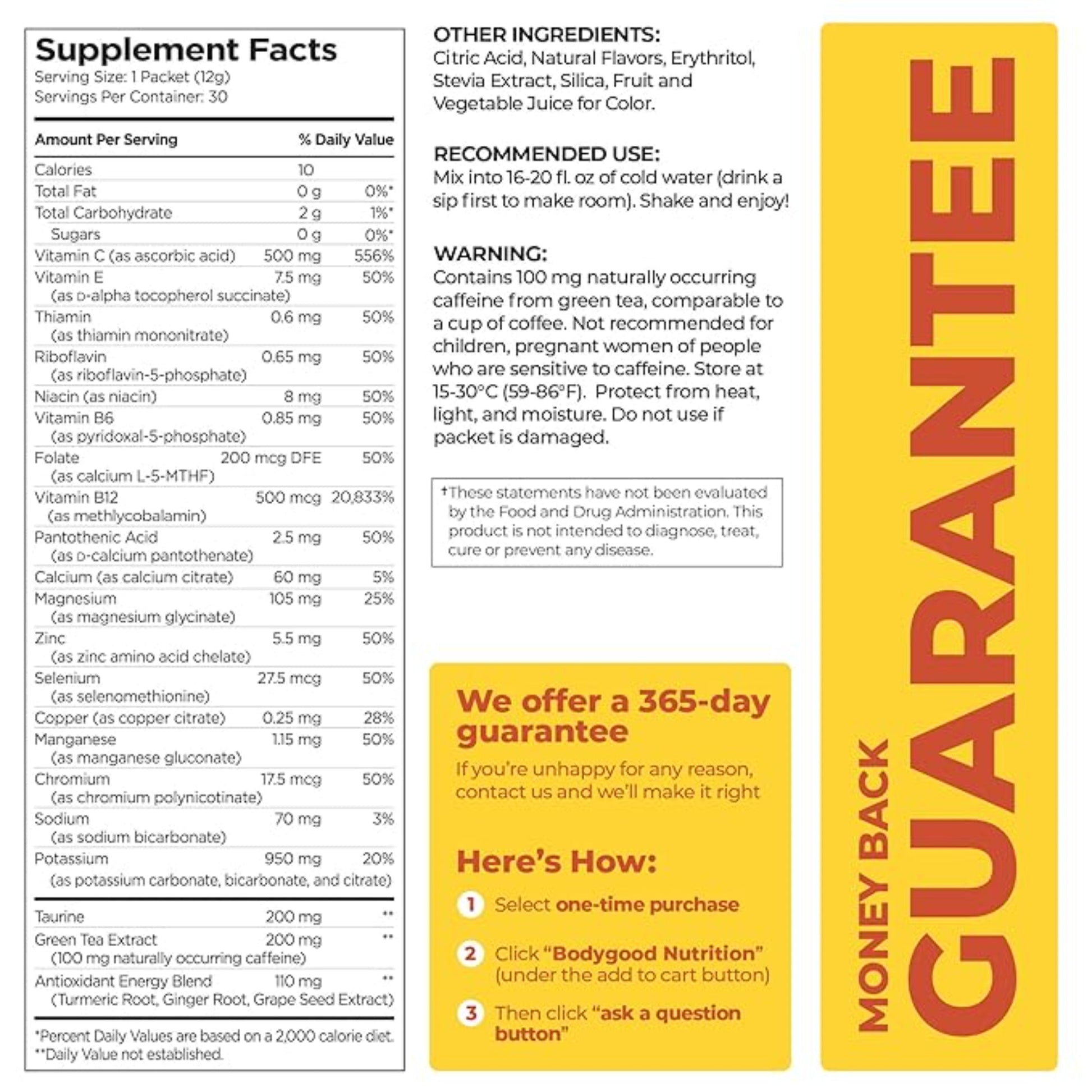 100 mg of natural green tea caffeine combined with B12 for a sustained, powerful energy boost. Skip the jitters and crashes—Pureboost is designed to keep you going and feeling good. Our sugar-free, sucralose-free mix delivers a delicious healthy boost—no artificial flavors, colors, or GMOs. Naturally sweetened. Each packet is a powerhouse of 25 vitamins, minerals and herbs like Turmeric, Ginger, Vitamin C and Zinc plus electrolytes. Stay hydrated and energized while supporting your immune system.